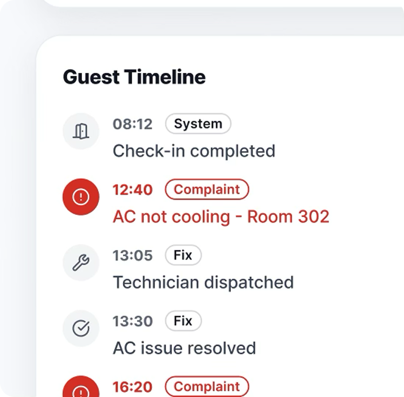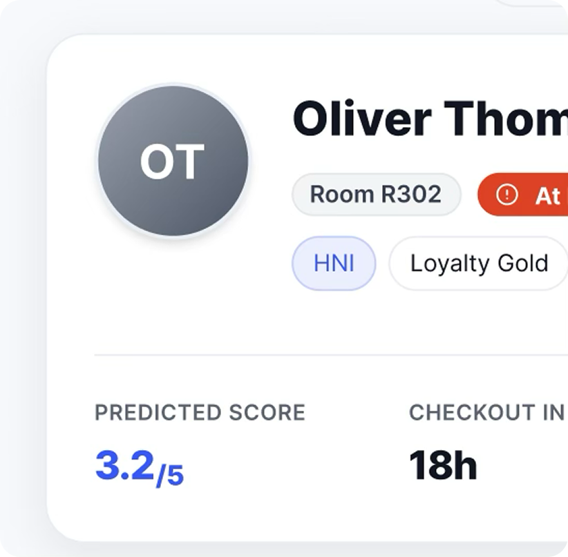 Most hotels discover dissatisfaction after checkout, when the damage is public. We surface risks in time and guide empathetic recovery so at‑risk guests leave happy.
